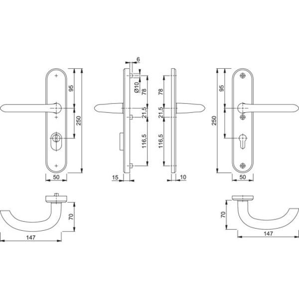 Incl. zichtbare bevestiging met 3 x M6 kruiskop bouten en deurkruk-gatdelen.