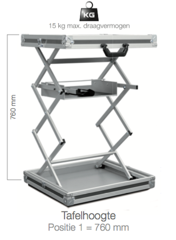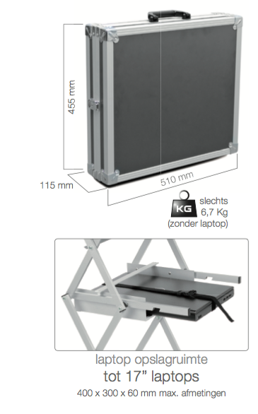 Het is ontworpen met oog voor mobiliteit en gebruiksgemak. De koffer biedt voldoende opslagruimte voor laptops tot 17 inch en kan eenvoudig worden ingesteld op twee werkhoogtes: 76 cm en 102 cm. Dit maakt het perfect voor uiteenlopende werkplekken en situaties.