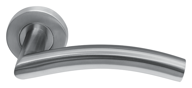 Gebogen deurkrukken op een geveerd rond rozetje in het rvs 304.